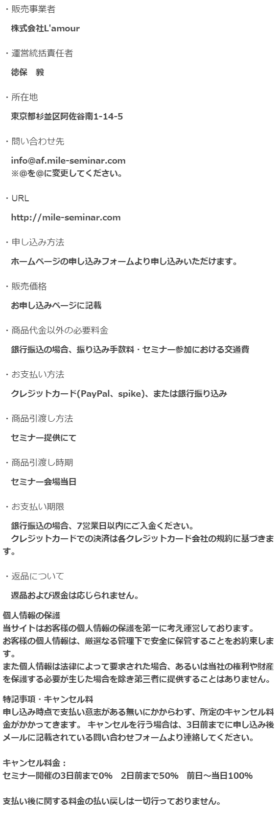 8.遅刻をする場合は、事前に問い合わせフォーム(http://mile-seminar.com/contact)より連絡をお願い致します。問い合わせフォーム以外での連絡(電話、メール等)による連絡は受付しておりません。当日、開始5分を過ぎての入場は進行によってお待ち頂く場合があります。尚、問い合わせフォームによる事前連絡が無く、30分を過ぎてでのご参加の場合、受付できかねる場合がございます。