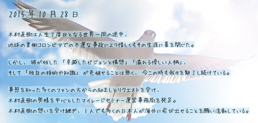 年間180日以上を海外で過ごし、2014年末には約1ヶ月半をかけマイルで全行程ビジネスクラス世界一周を達成、2015年5月から約7ヶ月をかけ2回目のビジネスクラス世界一周へ。
